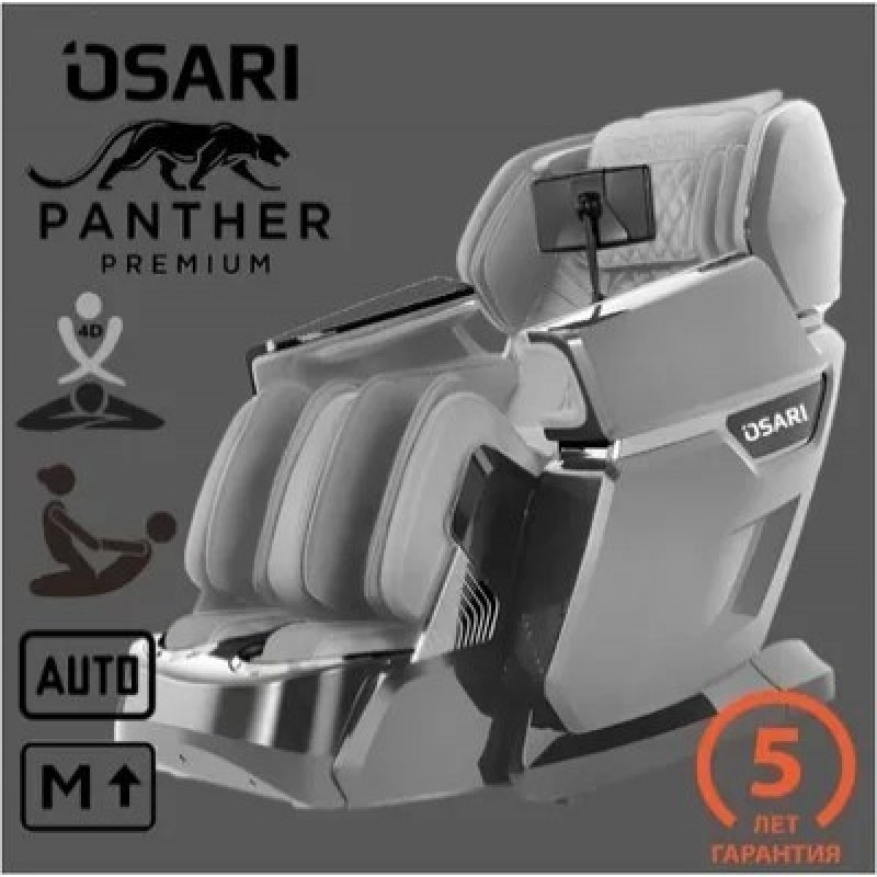 Массажное кресло Osari Pantera класса LUXE c 4D массажем и функционалом самого последнего поколения.Одно из лучших массажных кресел в России по отзывам клиентов!ОБЩЕЕ ОПИСАНИЕКресло Osari Pantera оснащено новейшей 4D роликовой массажной кареткой с воздушно-компрессионными подушками (60 слотов) для лимфодренажного массажа, равномерно распределёнными по всей массажной поверхности. Многофункциональная автоматическая массажная подножка обеспечивает максимально детальный массаж ногКресло полностью русифицировано. Для удобства управления имеет 7 дюймовый интуитивно понятный и информативный дисплей с насыщенным функционаломДля изготовления массажного кресла используются экологичные материалы LUXE класса, высокие стандарты качества обеспечивают износостойкость, долговечность и простоту в уходеСОВРЕМЕННАЯ СИСТЕМА 4D МАССАЖАРоликовый 4D массаж на сегодняшний день является передовой технологией в сегменте LUXE. Широкий диапазон возможностей роликовой массажной каретки кресла Osari Pantera позволяет получить максимально возможный охват и глубину проработки мышц.Самая высокая массажная каретка в России SL 145 см обеспечивает глубокую проработку тела от верхней части шеи до бедер и ягодицДЕТАЛЬНОЕ СКАНИРОВАНИЕ ТЕЛАМассажное кресло Osari Pantera осуществляет полное сканирование тела: адаптация кресла под рост, вес и конституционное строение человека.Встроенный “Миотонограф” (система определения тонуса мышц) позволит адаптироваться массажерам под ваше текущее физическое и эмоциональное состояние.После включения кресла не отрывайте тело от поверхности массажного кресла, дождитесь завершения сканирования9 МАССАЖНЫХ ТЕХНИК Функционал массажного кресла позволяет одновременно наслаждаться девятью техниками массажа одновременно: шиацу, лимфодренажный, похлопывание, растягивание, роллинг массаж, вибрация, точечный, разминание, скручивание24 АВТОМАТИЧЕСКИЕ ПРОГРАММЫ (8 класических,8 индивидуальных,8 по зонам)Автоматические программы задействуют популярнейшие техники массажа:В любое время можно проработать все группы мышц до полного расслабления, улучшить кровообращение, снять напряжение и снизить стрессПримеры режимов: вечерний, успокаивающий, антистресс.После продолжительного сна или монотонной работы не требующей физической активности с помощью специализированных режимов вы можете привести мышцы в тонус и получить заряд энергии. Примеры режимов: растяжка, тонизирующий, восстановление, утреннийШирокая база персонализированных программ в массажном кресле Osari Pantera позволяет в один клик выбрать режим, адаптированный под ваш образ жизни. Примеры режимов: директор, домохозяйка, автолюбитель, менеджер, спортсмен Конфигуративные настройки - каждый режим имеет персональные дополнения: изменения уровня силы, интенсивности, позиции. Продолжительность режимов 15 минут с возможностью изменения от 5 до 30 минут (шаг 5 минут)РУЧНОЕ УПРАВЛЕНИЕВозможности ручного управления позволяют использовать массажное кресло Osari Pantera для решения локальных проблем в определенных участках тела, открывая бесконечные возможности: точечная настройка зоны массажа, выбор желаемой техники массажа или нескольких, персональная регулировка интенсивности и силы воздействия массажеров, выбор удобного положения кресла и массажной подножки, сохранение заданных парамет