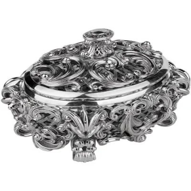 Серебряная шкатулка для ювелирных украшений выполнена из серебра 925 пробы с родированием. Высота 80 мм, длина 95 мм, ширина 77 мм.